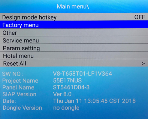 The 55E17NUS has a series of service menus accessible by entering the right combination of codes via the remote control. These menus sit outside the Android environment and provide access and information not normally available within Android TV. To enter these codes, first enter the Settings menu by hitting the cog icon on the remote control. Select Picture then Advanced Settings and then highlight Contrast. While Contrast is highlighted, enter one of the service codes below using the remote: